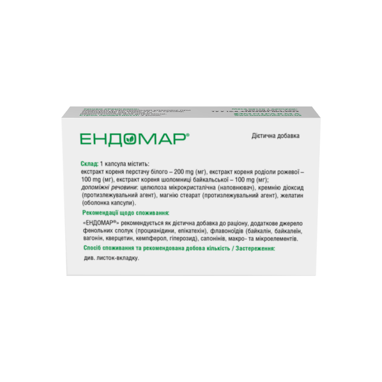 «ЕНДОМАР®» рекомендується в якості дієтичної добавки до раціону харчування як джерело фенольних сполук (процианідин, епікатехін), флавоноїдів (байкалін, байкалеїн, вагонін, кверцетин, кемпферол, гіперозид), сапонінів, а також корисних макро- та мікроелементів.